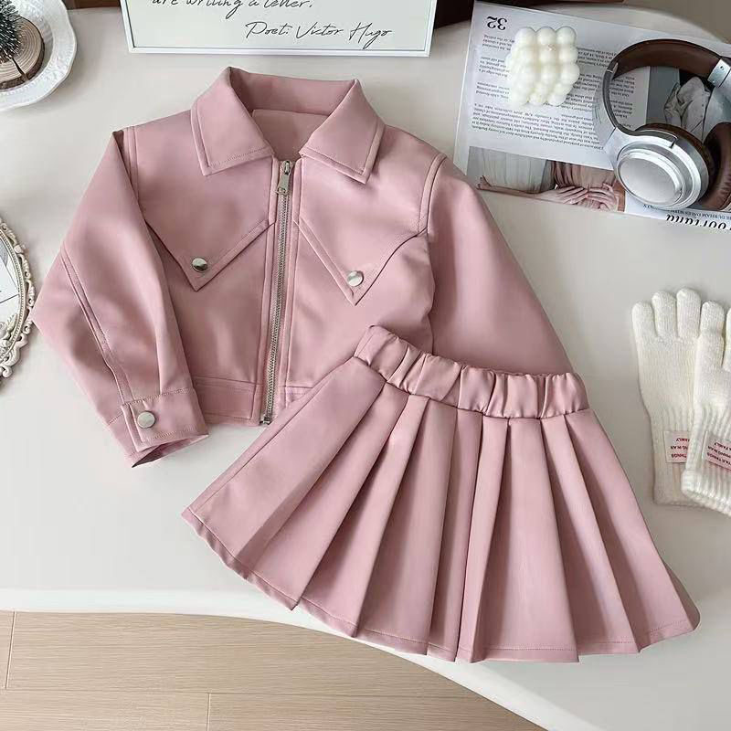 التصنيف: طقم بناتي قطعتين جاكت جلد لون بينك وجيب جلد بينك