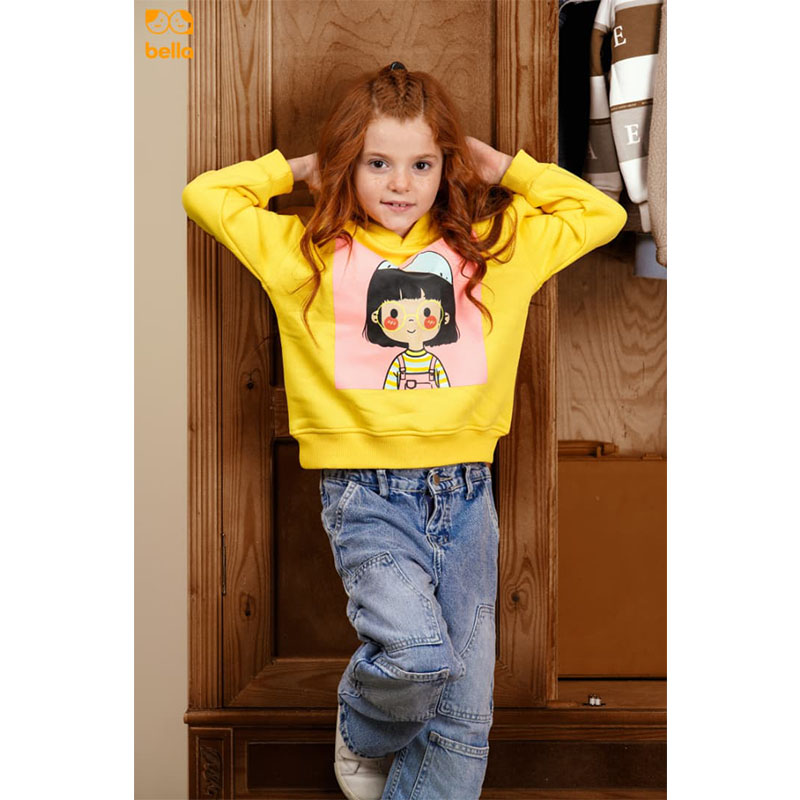 سويت شيرت بناتي شتوي لون أصفر بكابيشو مطبوع به بنوتة بنضارة