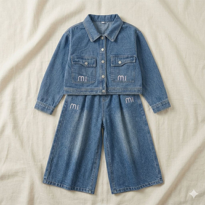 جاكت جينز بناتي لون جينز فاتح متطرز بكلمة وبنطلون وايد ليج