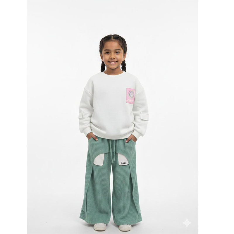 سويت شيرت أبيض وبنطلون قطيفة مضلع لون أخضر فاتح