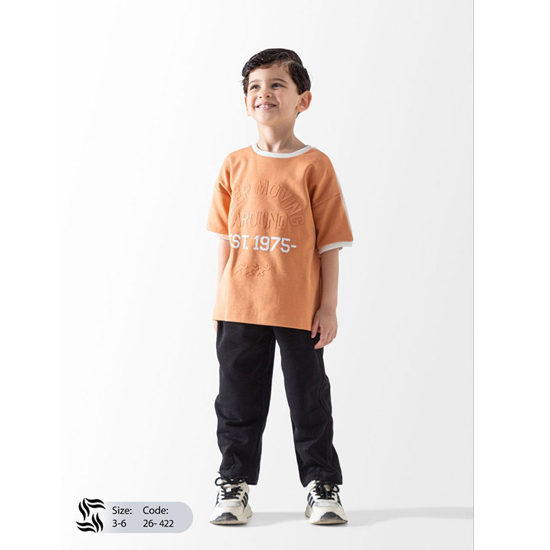 ترنج أولادي صيفي تيشرت نص كم اورانج فاتح وبنطلون ميلتون اسود