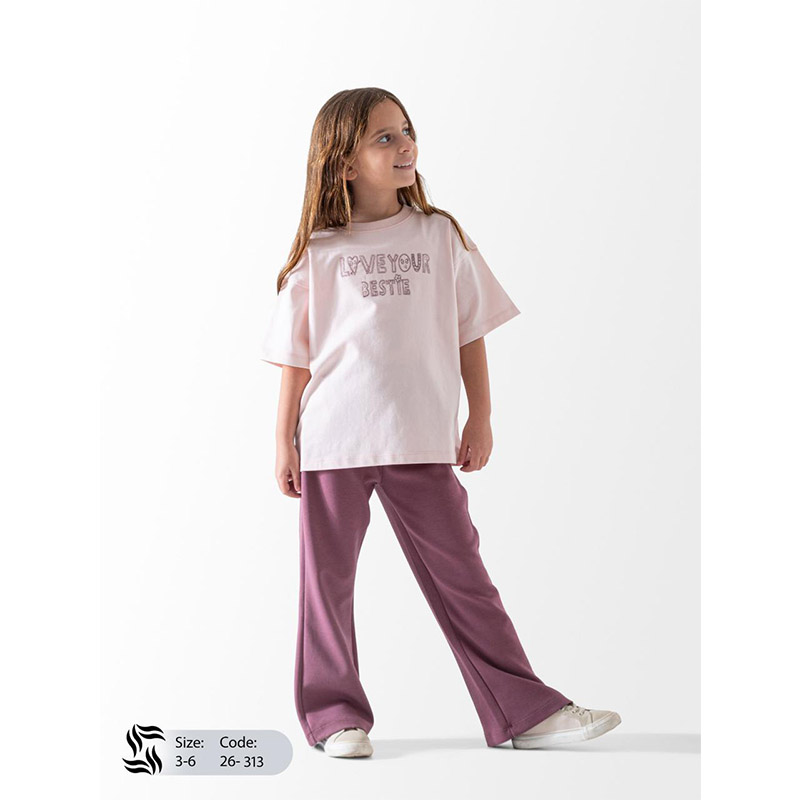 ترنج بناتي تيشرت نص كام لون بينك وبنطلون وايد ليج لون كشمير