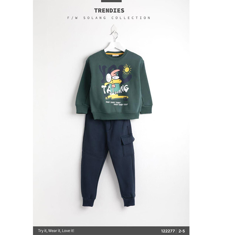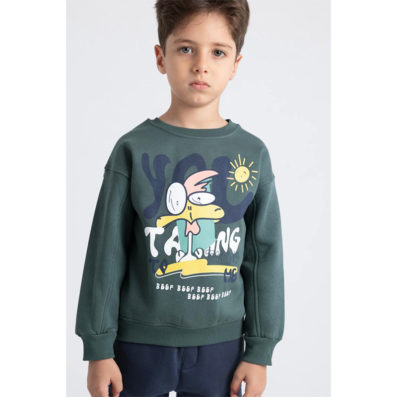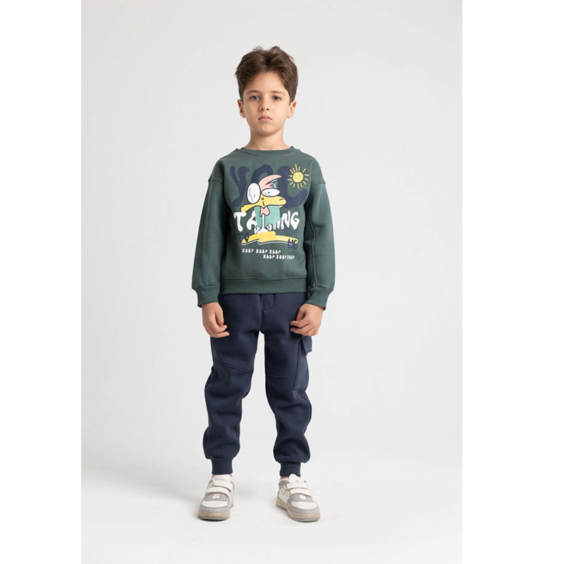 ترنج أولادي سويت شيرت زيتي به رسومات وبنطلون ميلتون كحلي